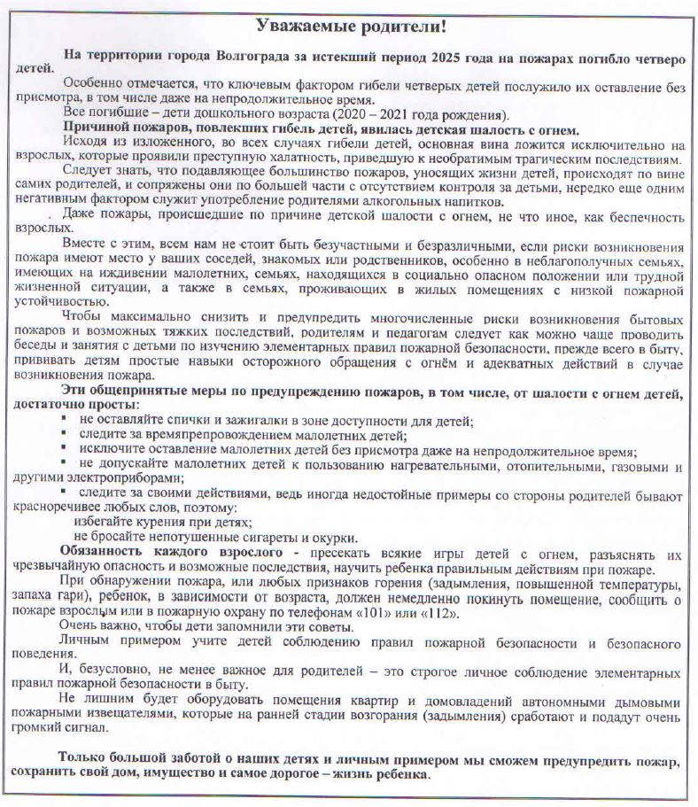 С начала 2025 года на территории Волгограда зарегистрирован 59 пожаров, по сравнению с аналогичным периодом 2024 ситуация стабильная (АП-59). В результате пожаров погибло 9 человек, в том числе 3 несовершеннолетних детей, рост в 3 раза (АП-3), травмы различной степени тяжести получили 4 человека, рост на 33,3% (АП-3).